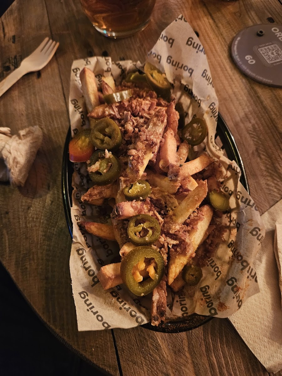 Great bar for the football and food. Friendly bar staff. Spacious and comfortable outdoor area. The food from boring burger is amazing. Live music every Friday evening. Visited this place this evening, working away from home and would recommend a visit. Boring burger offer a deal with a burger , chips and the option of a soft drink or alcoholic. Try it!